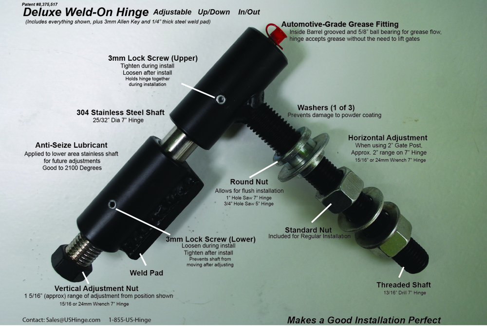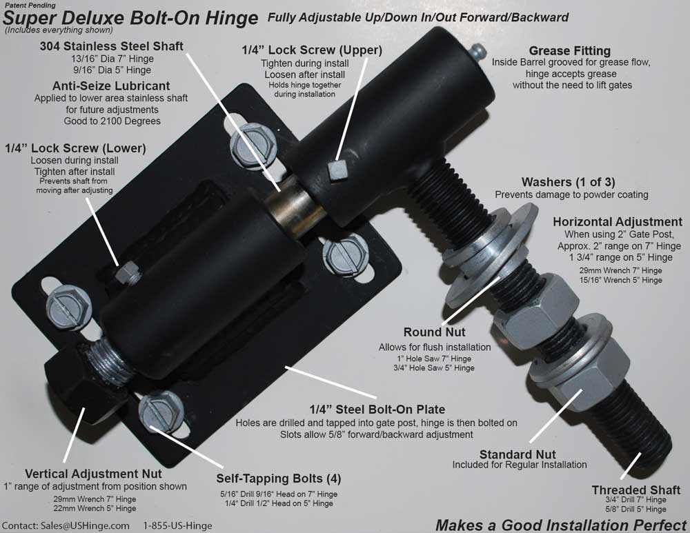 All of our hinges include grease fittings with ball bearing, stainless shafts, upper and lower set screws, washers and adjustment nuts. All hinges feature 1" of vertical adjustment and 2" (1" in or out per hinge) of horizontal adjustment, and Super Deluxe hinges also have 3/4" of lateral (forward/backward) adjustment on the gate post. Hinge capacity per pair is 250lbs